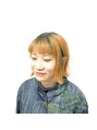 ブリーチカラーしました。根元は深いグリーン。全体はオレンジ色でかぼちゃカラーにしました。根元の赤みが取れて綺麗に退色するので 根元を深めの色にするのはおすすめです。カットは切りっぱなしのあごボブです。