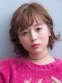 顎の長さのボブに外ハネ有りのランダムなカールのパーマをかけます。すっきり感を出すために両サイドを耳にかけて顔をスッキリ出してスタイリング。カラーはオレンジベージュで肌色に合う柔らかな質感に。すごく柔らかい優しいイメージに仕上げました。