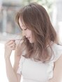 斜めバングがポイントのセミロングスタイル。ヘアカラーはイルミナベージュで柔らかさと透明感を演出しました。32mmのコテを使用。ポイントは毛先が外ハネになるように巻くことで今っぽいスタイリングに。
