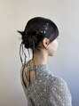 低め位置でまとめたタイトアレンジ。編み込みを入れて、後ろ姿にさりげないデザイン性をプラスしました。黒リボンと金箔で甘さを抑えた大人っぽい雰囲気に。結婚式やパーティーなど、特別な日のヘアアレンジにおすすめです。