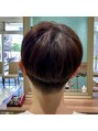 前髪は眉毛と生え際の間でワイドにショートバングにカット。襟足は刈り上げてコンパクトに、トップはボリュームが出る程度にレイヤーを入れてカット。