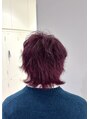 カットのベースはウルフカットでトップにレイヤーを少しつけてます。カラーは1度ブリーチで明るくして、その後イルミナカラーのトワイライトとブロッサムを混ぜてレッドバイオレットに染めてます。最後に波巻き風にアイロンで仕上げ。