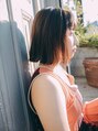 前髪は眉ラインで長さはあご下のパッツンボブです。コンパクトなシルエットになるようカットしています。風になびいた時や耳にかけた時にアクセントになるようイヤリングカラーをしています。幅や色はデザインによって。