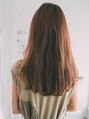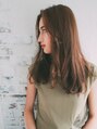 全体に重ためにカットされたロングスタイルです。前髪はリバースにながれるようになっているので顔まわりはそこまで重たく見えないようになっています。カラーリングはツヤ感がでやすいナチュラルなブラウン系です。