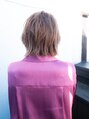 切りっぱなしのショートに外ハネをプラス。ハイトーンのカラーにすることと、顔まわりにウェーブをつけることで明るい雰囲気がでます。 全体の重さを上に持っていき、襟足を跳ねさせることで首周りを締め、今っぽい印象に。
