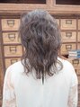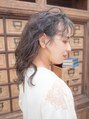 全体的に重さをとり鎖骨下のセミロングレイヤースタイル。くせ毛風の大きめカールがポイント!前髪も広めにとってワイドバングにして薄く大きい隙間を作ることで目ヂカラが強調されます!細かく細い束感を出して少し軽さをプラス!