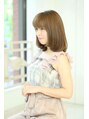 大人かわいいボブスタイル。全体的に重めなスタイルに見えないように前髪には、少しスリットを、顔まわりに少しレイヤーをいれ、より小顔に見える似合わせカットをしてあります。カラーは、9レベルのベージュカラーで、柔らかさもプラス!