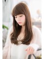 厚めにとった斜めバング&毛先のほんのり内巻きワンカールのシンプルなストレートロング。深みあるイノセントカラーで、重めスタイルをこっくりと落ち着いた雰囲気に仕上げます。サイドのレイヤーで顔を包み込み小顔バランスに。厚めバングで目力もUP!