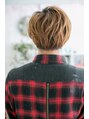 長めの斜めバングで目元を印象つけたエアリーマッシュショート。重めスタイルでも、明るいハイトーンと動きあるニュアンスパーマで軽い仕上がりに。耳元と襟足をスッキリさせて清潔感キープ。流行の七三やサイドパートで旬顔にアップデートしたモテショート。