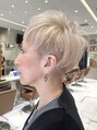 立体感のあるショートスタイルは前後とトップとアウトラインで長短をつけてデザインしています。シンプルかつクリアなハイトーンはケアブリーチで優しくリフトアップしてからオンカラーで柔らかいプラチナベージュを入れています。