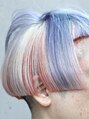 2セクションのショートボブはハチ下を刈り上げてコンパクトに。カラーリングはブリーチで明るくしてから、肌に合わせたオレンジ、パープル、イエロー、グリーンをパネルで組み合わせたマルチカラーに。一人一人にあわせたデザインは是非ご相談ください!