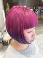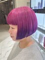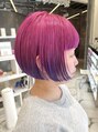 やや前下がりのボブスタイルはアンダーを刈り上げてコンパクトに。カラーリングは一度ブリーチをしてからビビットなピンク~パープルのグラデーションカラー。カットやカラーのデザインを楽しみたい方におすすめです!