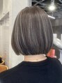 顎下に来るラインのボブでカットハイライトをブリーチで入れたら周りをグレージュで暗めに染め、ハイライト部分はサラッと色を入れました。紫シャンプーなどで色持ちアップがおすすめです。