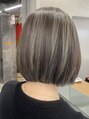 顎下に来るラインのボブでカットハイライトをブリーチで入れたら周りをグレージュで暗めに染め、ハイライト部分はサラッと色を入れました。紫シャンプーなどで色持ちアップがおすすめです。