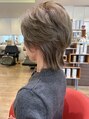 襟足長めのショートウルフスタイルです。白髪ぼかしのハイトーンのベージュカラーでぼかして柔らかさをだしています。白髪率70%以上の方にオススメなカラーです