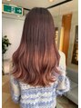 落ち着いたブラウンをベースに、毛先へ向かってほんのりピンクを感じるグラデーションカラー。ツヤ感のある質感で、柔らかな動きと立体感を演出しています。派手すぎず上品なので、季節問わず楽しめる大人可愛いスタイルです。