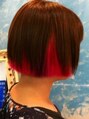 表面をアッシュブラウンに、こめかみ下をピンクメインに、ブルーとパープルを少々味つけしてみたリップラインのボブです。