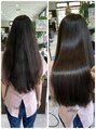 髪が多くロングヘアーで多毛でまとまりにくいのがお悩み。酸性縮毛矯正でハンドブローで乾かすだけでまとまりのよい髪に。初めての矯正なので感動して頂きました。