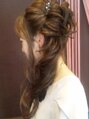 結婚式ハーフアップ☆ゆる巻きにし、トップをふくらまします。ネープの髪もアップしているので首まわりも気にしなくてOK!!15分ほどで仕上がりますよ♪