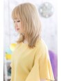 派手に見られがちなハイトーンの金髪スタイルは、くせ毛風外ハネカールのナチュラルセミディでリラクシーな雰囲気。顔周りを明るくして肌色キレイにやわらかく仕上げます。斜めバングや厚めバングで目力UPしたり、前下がりで小顔見せや耳かけも大人かわいい。
