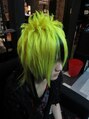 ブリーチ後蛍光黄色カラーにしました。前髪にポイントで黒メッシュがはいっています。カットはアシメV系カットです。