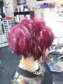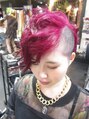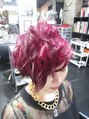 ブリーチ後マニックパニックでカラーしました。カットはサイドを刈り上げて、前下がりのショートです。最後はアイロンでパーマ風にセットしました。