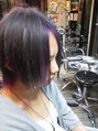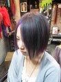 ベースの色をダークパープルグレーにカラーをして、内側やポイントで原色の紫をいれています。カットで前下がりショートスタイルです。動きが出しやすいように段をしっかりと入れたスタイルです。