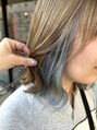 ハイトーンベージュに透け感ブルーのインナーカラーをプラスしています。耳にかけた時や動いた瞬間に色が見える、遊び心のあるデザインカラー♪26ミリのカールアイロンで巻いた外ハネのミディボブと相性抜群で、個性と可愛さを両立できます◎