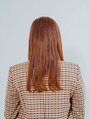 透け感のある明るめのオレンジカラーでツヤっぽく見せました。全体はワンレンベースで顔まわりに少しだけレイヤーを入れてカットします。バングはシャギーを入れて斜めに流せるようにカットします。