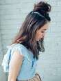 こめかみあたりからトップでお団子にしたアレンジスタイル。分け目はきっちり取らずに、ズグザグに取ることでラフでオシャレになります。逆毛でふわっとお団子にするのがポイントです。下ろした髪はゆるウェーブで☆