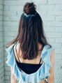 こめかみあたりからトップでお団子にしたアレンジスタイル。分け目はきっちり取らずに、ズグザグに取ることでラフでオシャレになります。逆毛でふわっとお団子にするのがポイントです。下ろした髪はゆるウェーブで☆