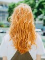 ヘアカラーは夏っぽくオレンジカラーにしています。スタイリングは、太めのコテを使って全体的にウェーブ感が出るように巻いています。前髪をかきあげると大人っぽい雰囲気を出すことができます。