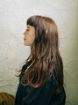前髪ぱっつんの大人かわいいロングスタイルです。カラーは暖色系で毛先はブリーチをしてオンカラーしています。毛先にいくにつれてグラデーションカラーにしているので重たく見えがちなロングスタイルに遊びを持たせています。