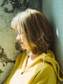 表面にレイヤーが入った前下がりボブです。カラーはブリーチを2回して黄味を抑えるためにバイオレット系カラーを薄めてオンカラーしています。26ミリのコテで毛先は外ハネにして表面はうねりっぽく形をつけていきます