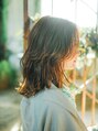 外ハネの重めなミディアムウルフスタイル!!毛先が重く見えないようにレイヤーを入れます。前髪を長くセンターで分けることで、大人っぽい雰囲気にします。ブラウン・ベージュ系のカラーリングで明るさをだします。