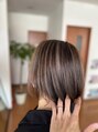 気になる白髪をぼかすために、ブリーチを使ったアンブレラカラーでアッシュベージュに。ベースを落ち着いたベージュ系、にしています。分け目や顔周りの白髪が気になる方にオススメです。※少し派手に見えます。