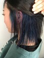 内側だけをブリーチして、ブルーとヴァイオレットの2色を入れました(^^)ブルーはしっかり染まるようにマニキュアよりのもので染めました☆鮮やかに染まるので、はっきりした色が好きな方はおすすめです☆表面は同系色でそろえて、暗めのブルーアッシュです☆