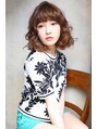 エッジのきいたモードフェミニンなラウンドボブに、しっかりめのカールをプラスしたミディアムヘア。どんなファッションにも合わせやすいように全体はモーブカラーで深みを出しています。重軽ミックスなるカットで重めバング、斜めバングとも相性◎