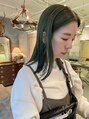ミディアムレングスで派手なミドリカラー◎ぱつっとしたラインとポリッシュオイルで仕上げたウェットなスタイルがおしゃれ◎