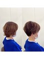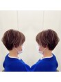 サイド下は耳に少しかぶる長さで短め、トップを長めにしたハンサムショートです。カラーはハイライトをまんべんなく入れ、全体的に明るくしており、白髪も目立ちにくくしています。