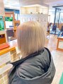 髪質、生え方、骨格に合わせた前下がりボブです。ブリーチ後ボンドカラー14トーンベージュ、シルバーライラックブロンドを調合しました。