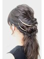 全体にウェーブをつけ、ハーフアップの状態でくるりんぱした後、両サイドをねじりながら真ん中でまとめすっきりとした印象のお呼ばれアレンジ。程よく全体をほぐし、まとまりすぎないようにすることと、、アクセサリーの使い方がポイント!【北長野・稲田】