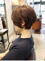 メリハリのある柔らかいシルエットショートスタイル。適度なボリューム感がポイント。カラーはクリーミーなベージュ系ブラウン。上品なイメージのスタイル。