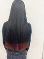 黒髪ストレート超ロングに毛先のデザインカラーをしたモードスタイル。毛先はアプリコットオレンジのブリーチして色をのせるデザインダブルカラーです。