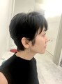 艶やかな黒髪、クセを生かした耳かけショート。前髪は目の上ラインで下ろしても流しても自由自在。スタイリング楽しめるスタイルです。