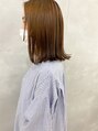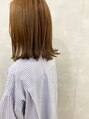切りっぱなしの肩につく位のストレートロブ。明るめのオレンジアッシュ系のカラーがツヤ感をアップしてます