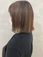 肩上のぱっつん切りっぱなしボブ。ナチュラルなブラウンカラーと少し印影をつけるのに隠しハイライトをいれたカラーにオイルで仕上げてやや外ハネに。