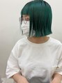 根本は黒髪を残し、毛先ブリーチからの鮮やかなグリーンをいれたデザインカラー。ビビッドな色でインパクトを出したカラーにオン眉、ぱっつんボブでかわいいスタイルです。