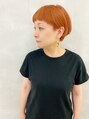 ハイトーンで淡いオレンジのマッシュ ショート。しっかりウエットにしてタイトに仕上げたのがポイントです。