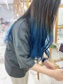毛先にブリーチ×2 カラー×1のトリプルカラーでつくるブルーカラー。ロングストレートにカッコいいデザインカラーをいれたスタイルです。